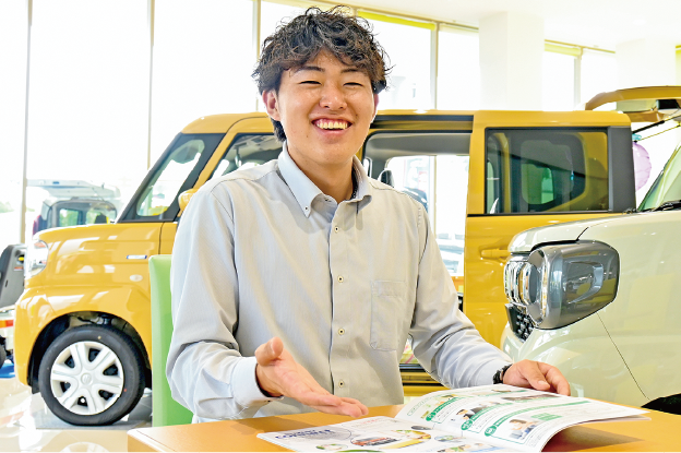 私の祖父はスズキ車を販売する「町の車屋さん」。幼い頃からスズキは身近な存在でした。時が経ち、進路に迷っていた時、販売サポートで祖父のもとを訪れる当社の営業担当が生き生きと働く姿を見て「営業職」に魅力を感じ、入社を決めました。実際に働き始めてからは、月に1回以上の有給取得推奨や、男性の高い育休取得率、女性のポスト復帰制度など、長く働き続けられる環境が整っていることを実感。上司や先輩が率先して制度を活用しているため、若手社員も気兼ねなく使うことができます。