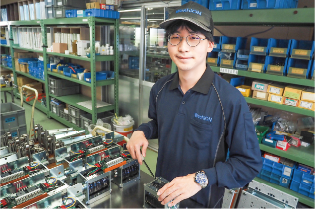 磁力を応用した製品の設計・製造・販売しているマグネット応用機器メーカーです。私は6人のチームの中で「マグネットチャック」の制御盤の設計をしています。マグネットチャックとは加工したい素材を工作機械に固定する部品。磁力で瞬時に固定と解除ができ、生産性向上に寄与します。電気制御のプログラムについて入社当初は全く知識がなく、仕事の中で覚えていきました。制御盤の中の部品配置は組み立ての担当と、部品の納期は購買担当と相談しながら進めます。